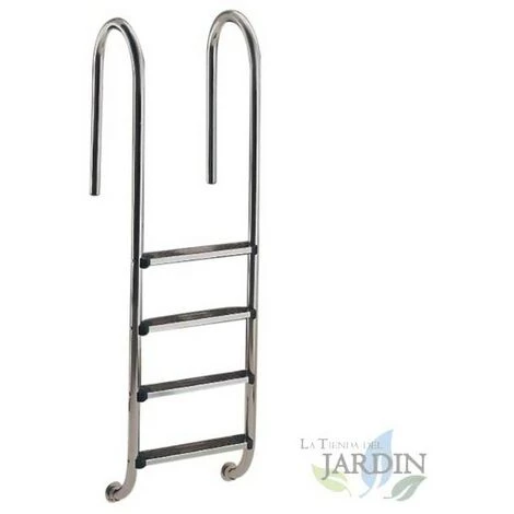 Escalier modèle Muro avec mains courantes, pour piscines enterrées, en tube d’acier inoxydable Ø43mm avec une finition polie brillante.