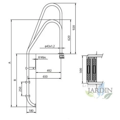 - Avec main courante modèle Standard, pour piscines enterrées, en tube inox Ø 43 mm finition poli brillant.